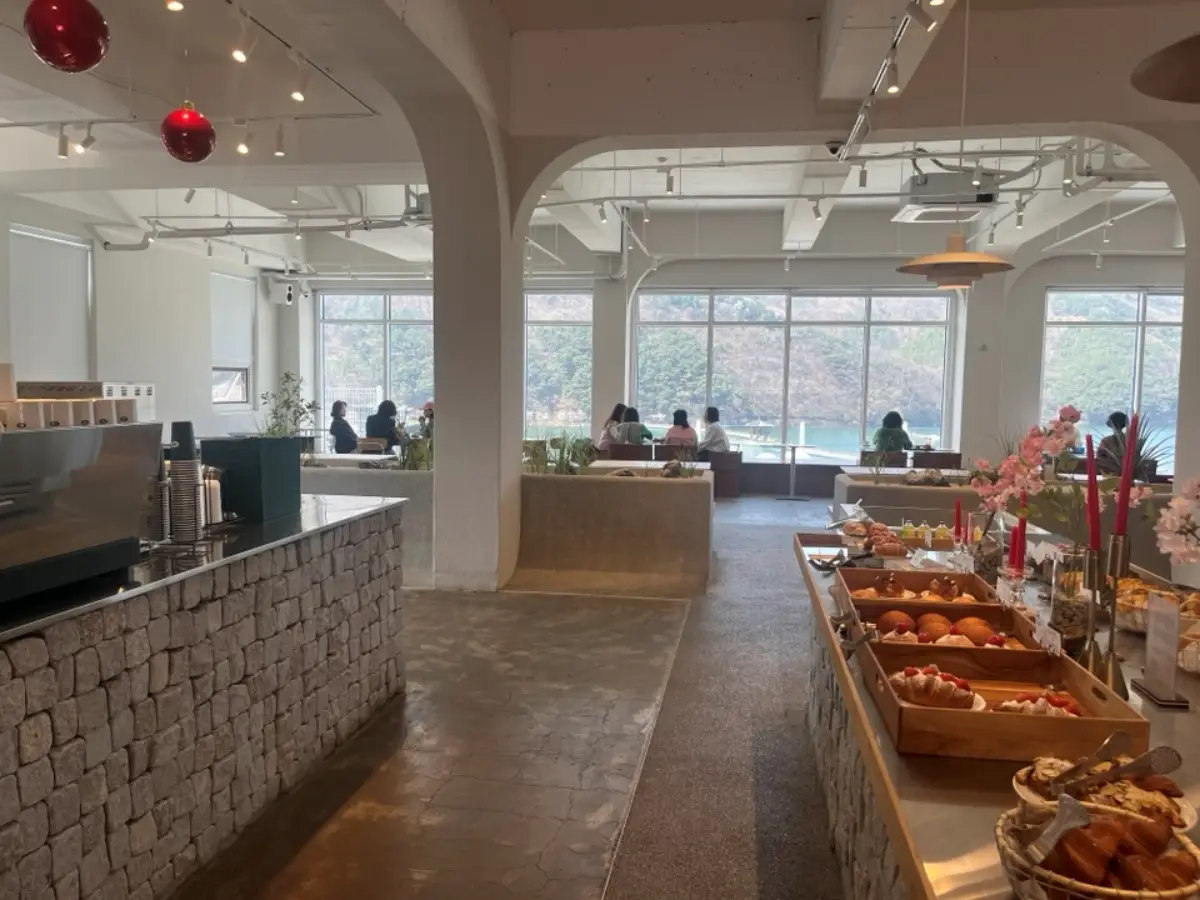 카페 들어서자마자 보이는 뷰입니다. 뷰 정말 예쁘죠? 한참 서서 창밖으로 보이는 풍경을 바라봤어요. 연신 카메라로 찍어면서
