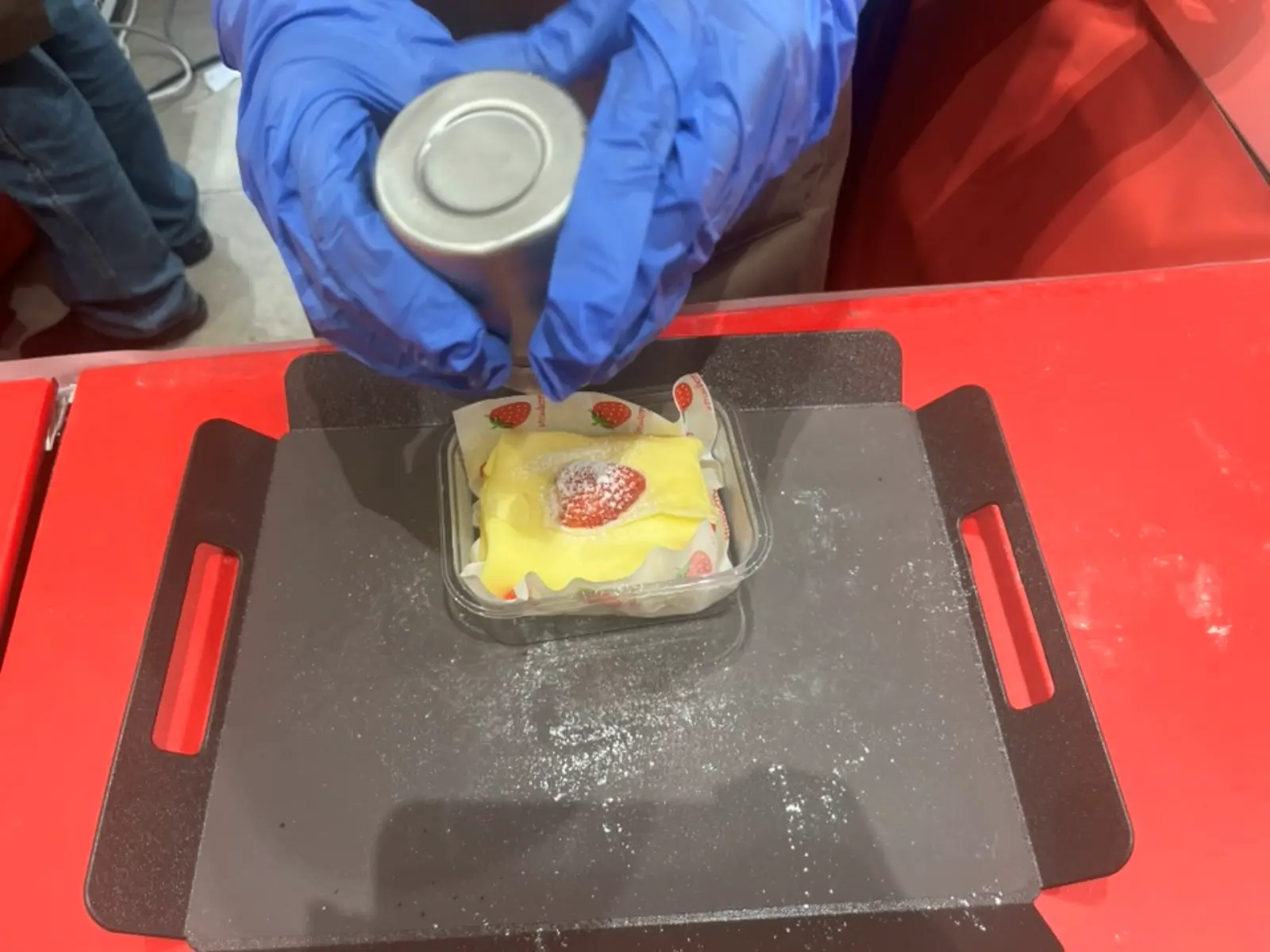 저는 예전부터 꼭 먹고 싶었던 수건케이크 중에서 딸기 몽땅 생크림이 너무나 먹고 싶어서 전 이거 하나 주문했어요~많은 사람들이 초코바나나도 사서 나도 한번 사볼까?라고 고민도 잠시 했지만, 그래도 먹고 싶었던 거 먹어야지 후회가 없기에 딸기 몽땅 생크림으로 주문을 했습니다. 제가 주문을 하면 옆에서 이렇게 슈가파우더를 뿌려주더라고요~