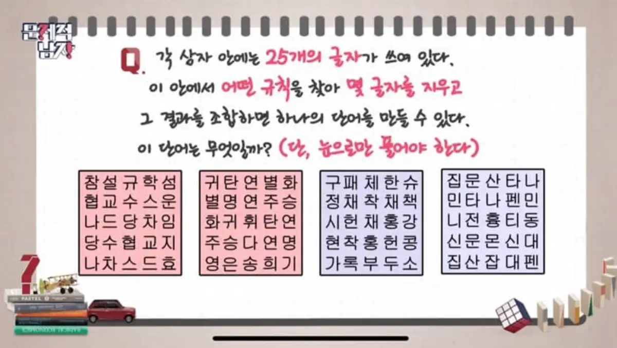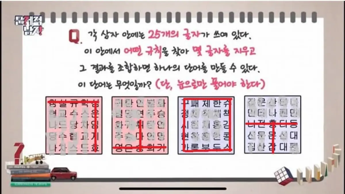 일단 저는 자음이 눈에 많이 보여서 자음을 지워나가봤습니다. 그러다가 안되서 자음 모음 같이 지워보구요.