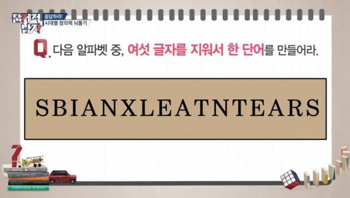 전혀 규칙성이 없는 알파벳들만 나열되어있네요. 그리고 한 단어를 만들어야 하는데 만들어야 하는 단어에 대한