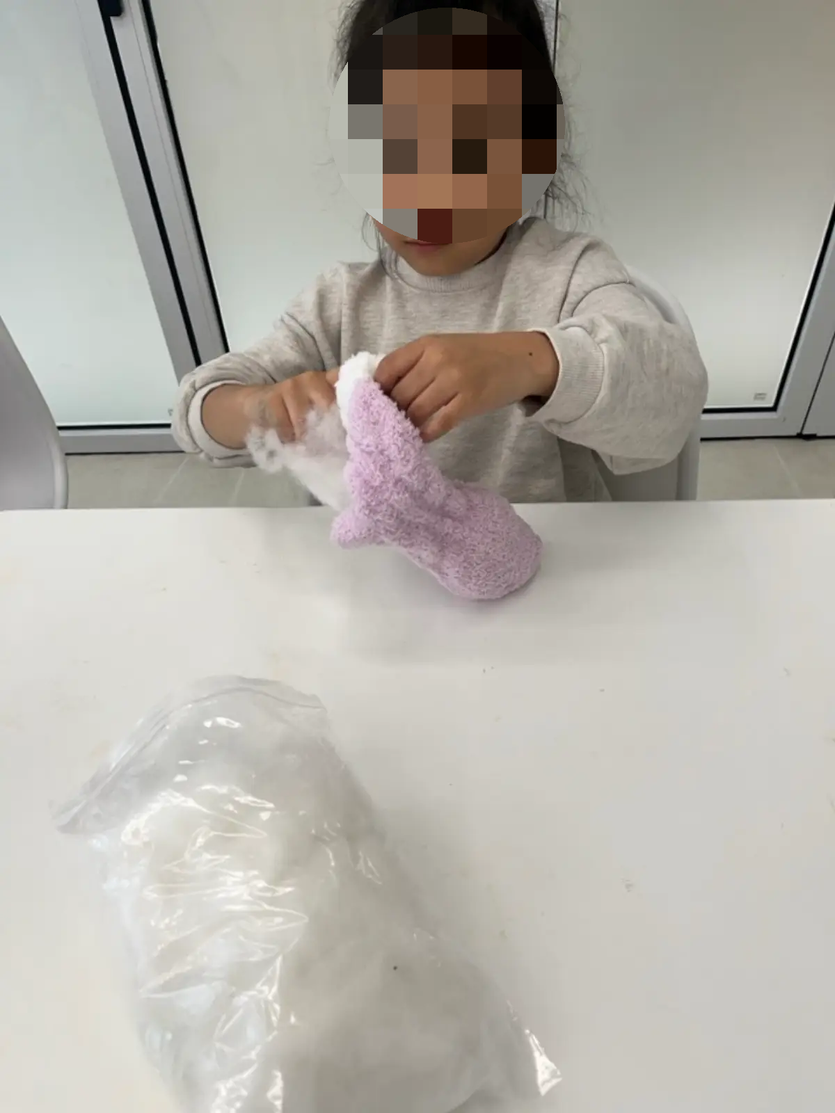 둘째. 솜을 양말의 3분의 2만 집어 넣고 양말 입구를 고무줄로 묶고 입구를 뒤집어줍니다.