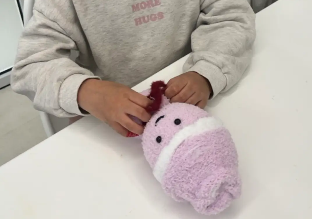 준비물 : 수면양말1짝, 솜, 고무줄 2개, 눈스티커(없으면 네임펜)