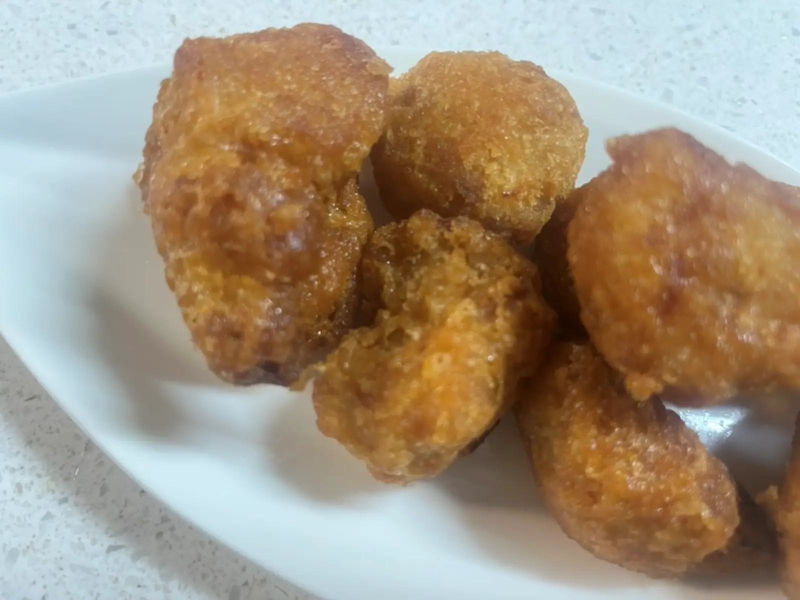 일반 치킨 너겟과는 다른 비주얼이죠? 치킨집 순살치킨과 모양이 같아요. 튀김옷을 보면 크리스피하게 바삭한 느낌의 튀김옷이에요. 보기와 다르게 더 바삭거려요.