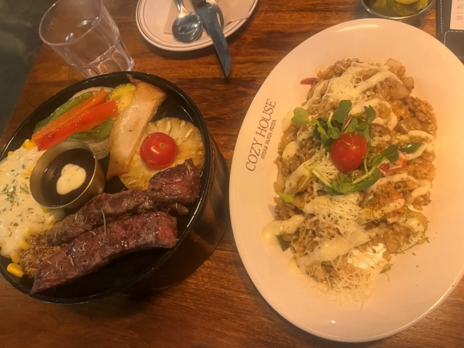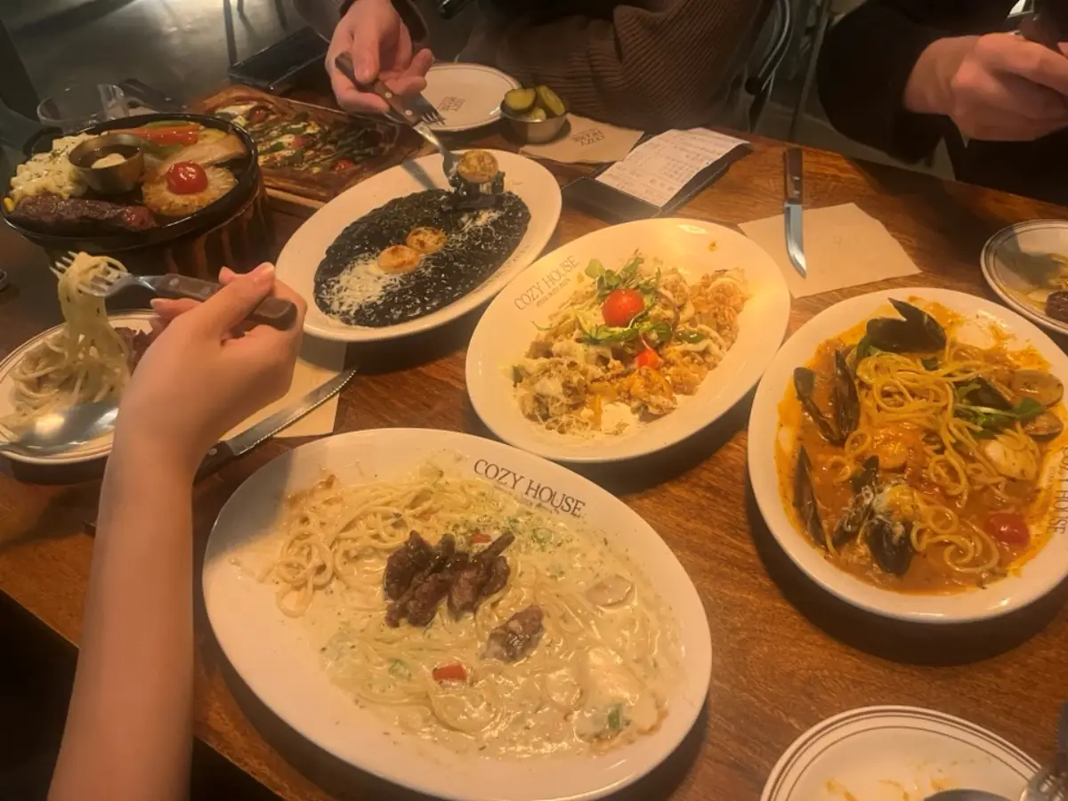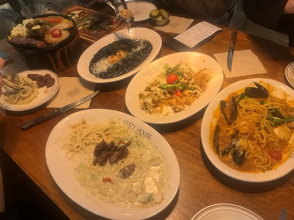 밑에 사진이 저희가 한상 거하게 차려 놓고 먹은 코지하우스 음식들이에요~ 나오자마자 바로 포크와 숟가락을 들고 먹기 시작했어요^^ 테이블이 꽉 차서 푸짐하게 보이죠? 각자 좋아하는 메뉴 1가지씩에 사이드로 피자도 시키고 필라프도 싴ㅆ더니 테이블이 꽉 차더라구요~
