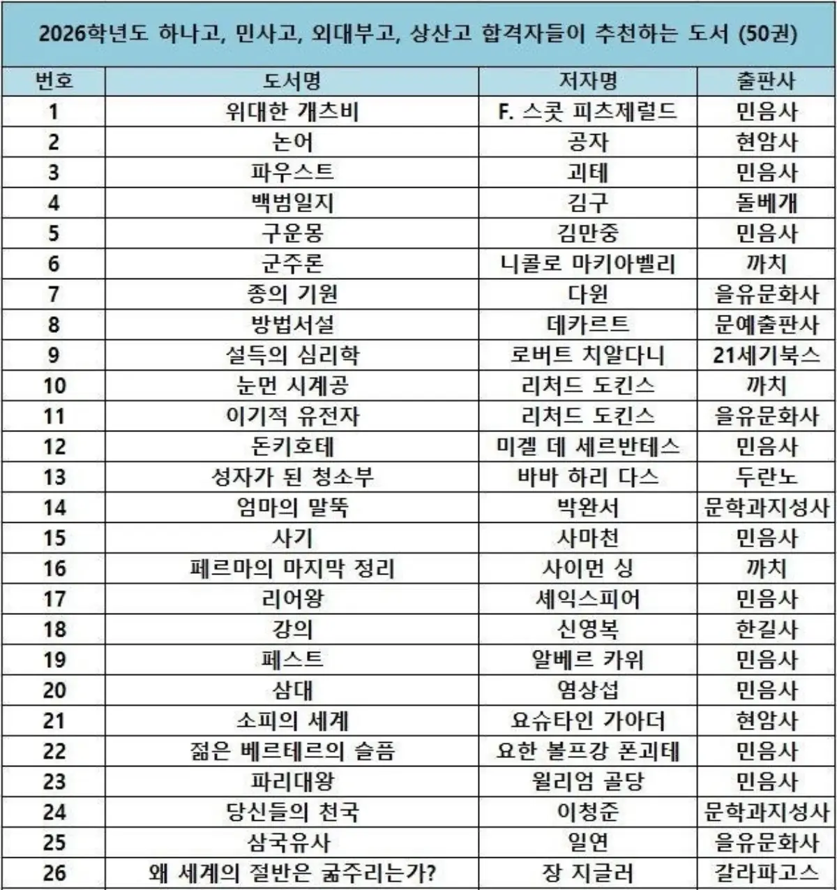 하나고, 민사고, 외대부고, 상산고 합격자 추천 도서