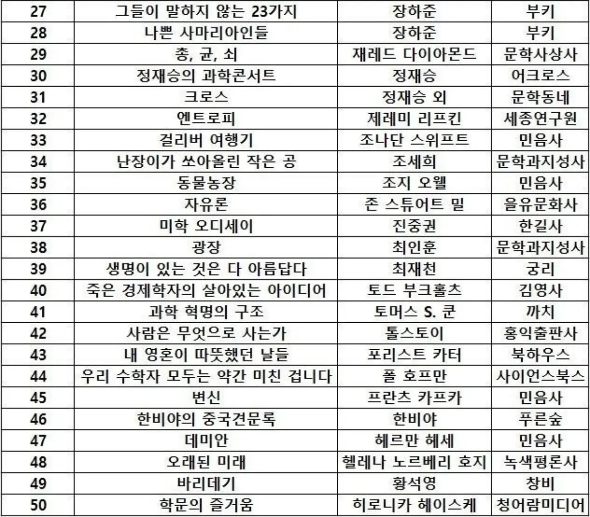 단순히 공부만 잘하면 갈 수 있는 고등학교는 아니라서 이 책들과 함께 준비 좀 하려고요. 제 아이의 목표는 이 50권의 책을 다 읽으면 좋겠지만 안된다면 반이상이라도 읽으려는 목표를 세웠습니다. 저는 과학고를 염두에 두고 있지만 제 아이는 민사고를 생각하고 있더라고요. 그래서 아래 추천 도서는 제 아이가 알려준 도서 목록이에요.