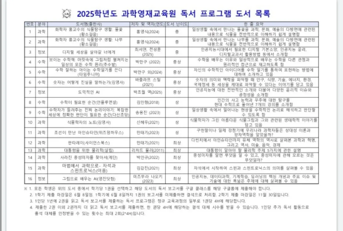 그리고 하나 더 준비했어요. 과학영재교육원에서 진행하고 있는 독서 프로그램 도서 목록입니다.