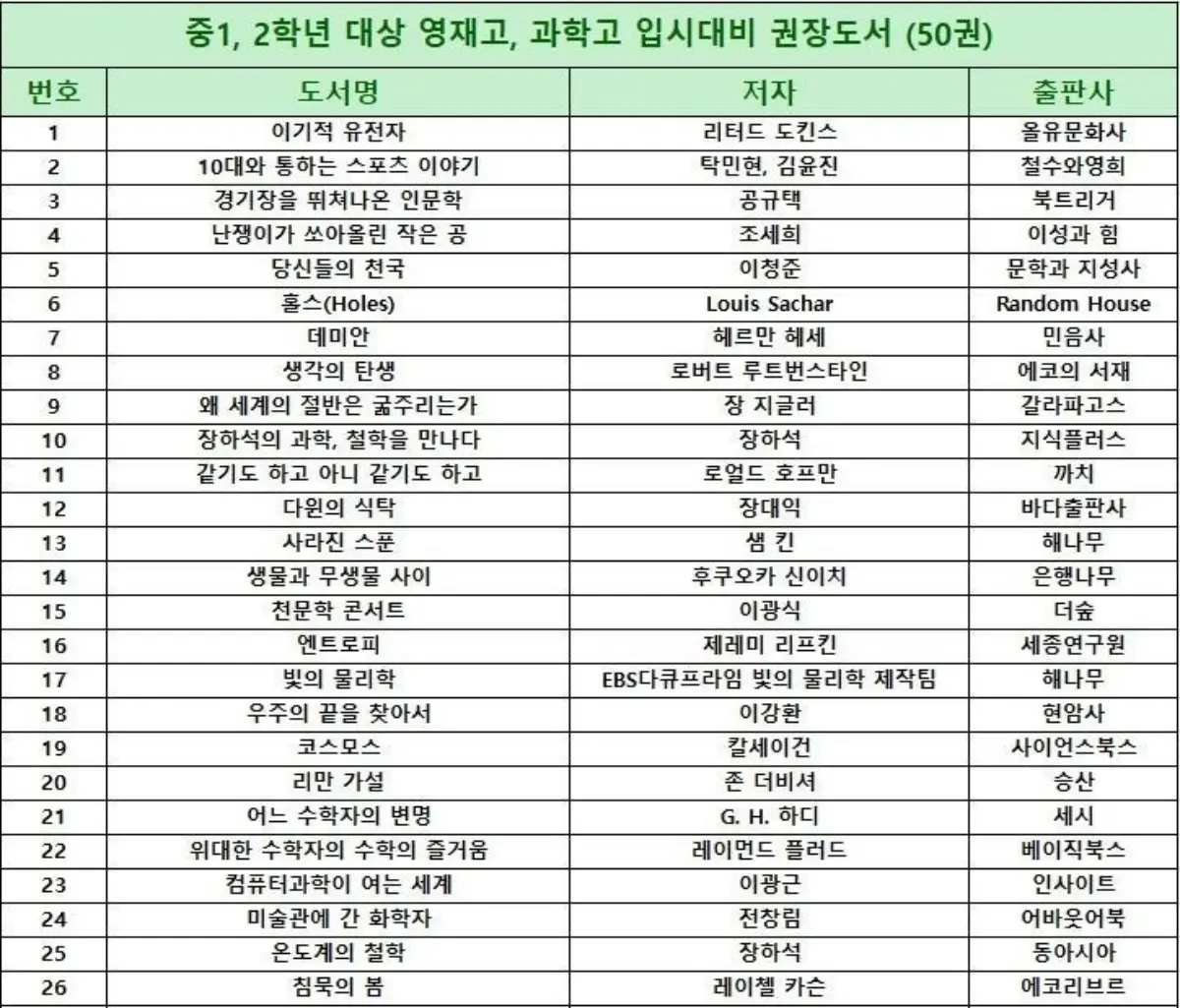 우리아이 영재고와 과학고 입시 준비에 반드시 읽어야 하는 필독서 50선입니다. 목록을 보시면 알겠지만 매우 다양한 장르의 책들이 있는데요. 스테디셀러부터 현재 교육환경에 맞는 책들도 있고 책을 좋아하는지라 제가 읽은 책들도 눈에 띄네요. 공부 잘하는 아이들은 이런 책들을 즐겨 읽는다고 하고, 반드시 읽어야 한다는 권장도서입니다.