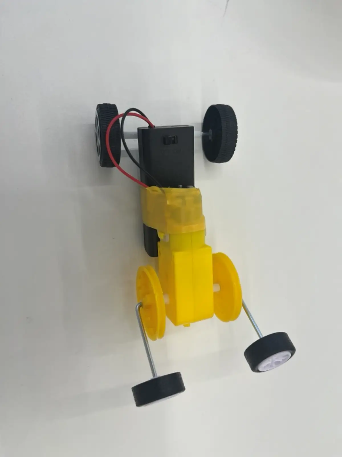 건전지에 전선도 한번 연결 해 보고 모터와 바퀴축에 바퀴도 끼워보았습니다.
