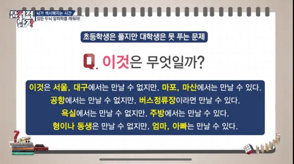 문제적 남자에서는 IQ140이상만 풀 수 있는 문제로 나온 퀴즈입니다. 저도 이 문제를 봤을때 IQ140이상만 풀 수 있는 문제라고 해서 지레 겁부터 먹고 어려울 것이라고 생각했어요. 그런데 잘 보면 제가 올린 이전 문제와 꽤 비슷한 문제도 있어서 조금은 어렵지않게 풀었던 것 같아요.