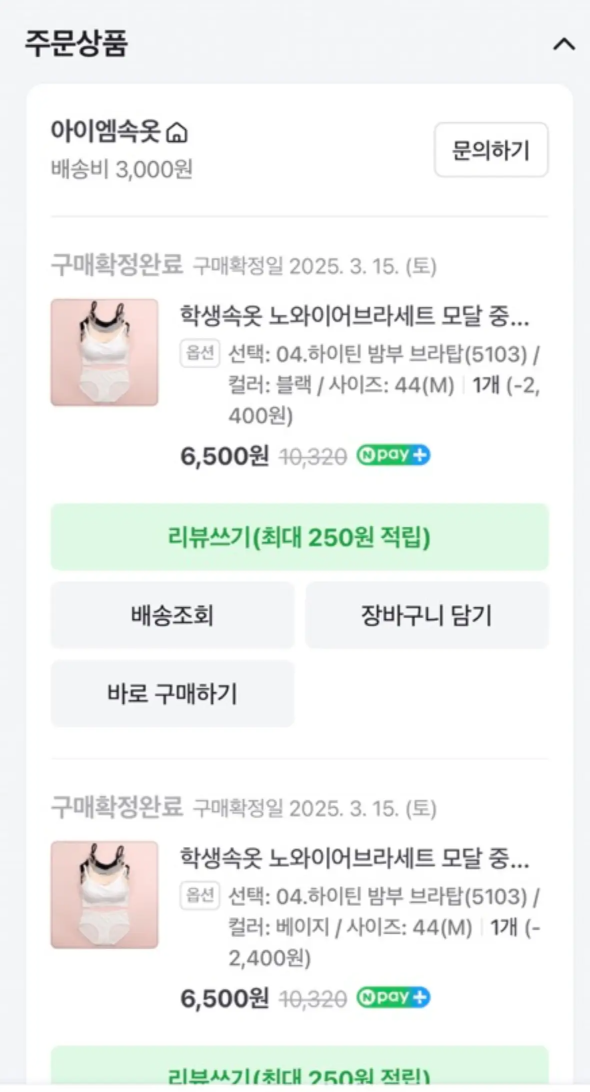 저는 이번 주문내역이 두 번째예요. 그전에 샀던 것이 너무 마음에 들어서 브라 2개랑 팬티도 샀어요. 원래 브라만 살 생각이었는데 팬티도 가격이 너무 괜찮아서 팬티 2개도 구매했어요.