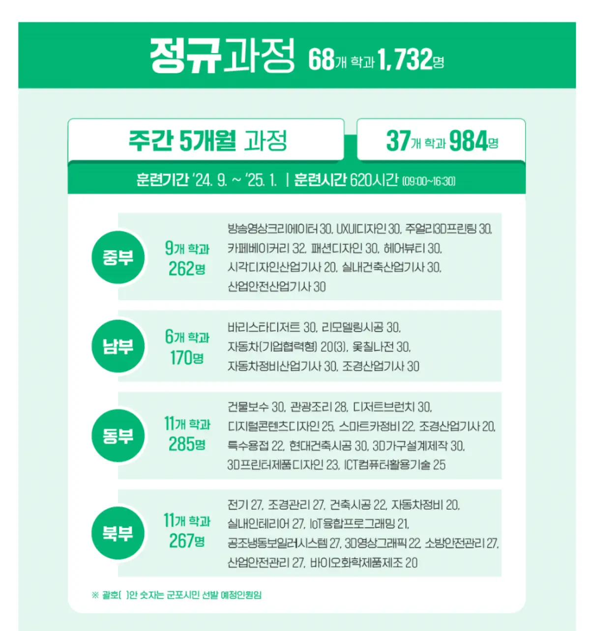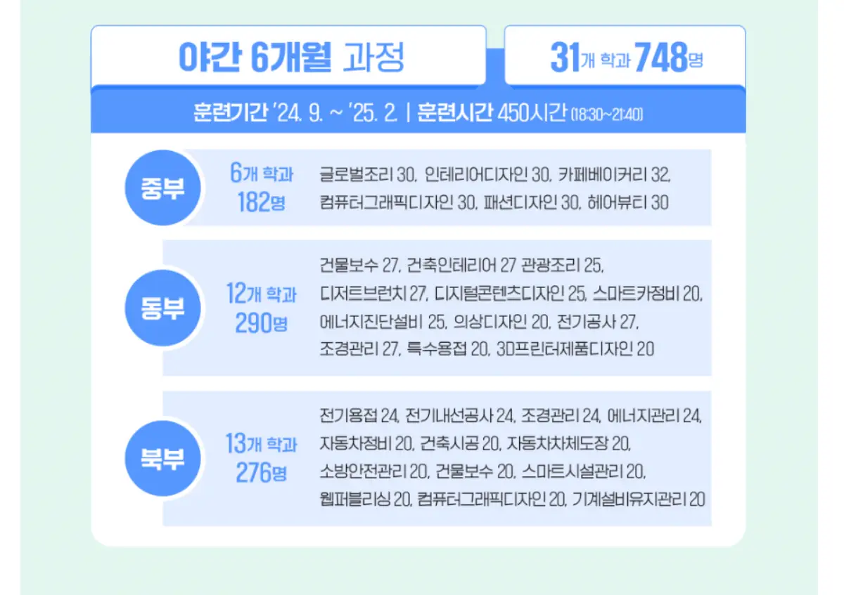 주간5개월 3D가구설계제작(30) 3D프린터제품디자인(23) ICT컴퓨터활용기술(25) 건물보수(30) 관광조리(28) 디저트브런치(30) 디지털콘텐츠디자인(25) 스마트카정비(22) 조경산업기사(20) 특수용접(22) 현