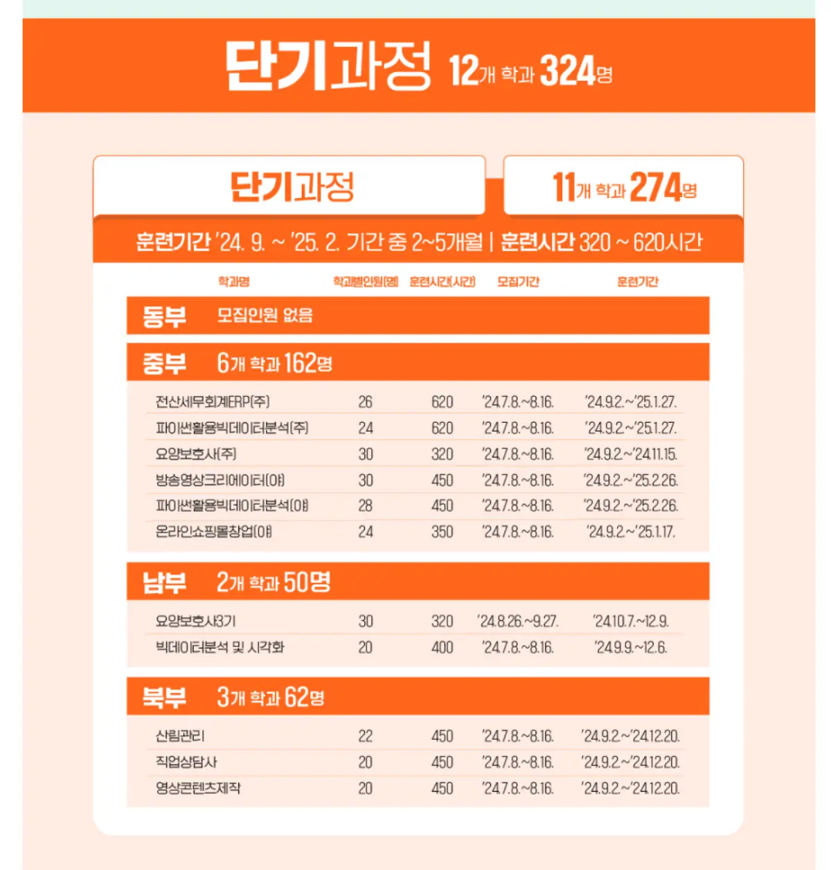 단기과정 방송영상크리에이터(단기야간)(30) 온라인쇼핑몰창업(단기야간)(24) 요양보호사(단기주간)(30) 전산세무회계ERP(단기주간)(26) 파이썬활용빅데이터분석(단기야간)(28) 파이썬활용빅데이터