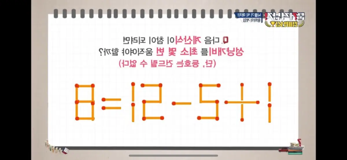 성냥개비를 움직이지 않고 거울에 비추어보면 되는 기존의 성냥개비 문제와는 형식이 다르죠? 역시 사람은 기존의 사고방식을 깨고 조금 더 다른 시각에서 생각할 필요가 있는 것 같습니다. 그럼 2번째 문제 들어갈게요.