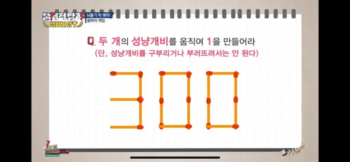 이번 문제는 반드시 2개의 성냥개비를 움직여서 1을 만들라고 하네요. 문제에 보이는 숫자는 300인데 성냥개비 2개 만을 이용해서 어떻게 1을 만들까요? 여기서도 생각의 틀을 살짝 바꾸셔야 합니다. 문제에서 이야기하는 것 외에 다른 것을 생각하셔야 합니다.