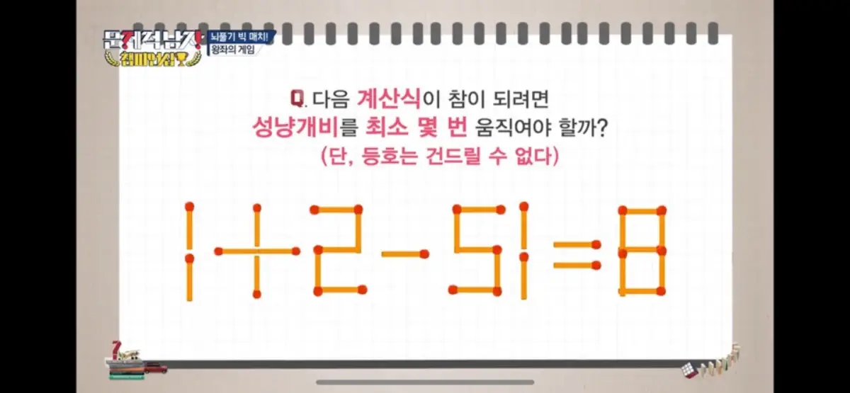 가장 기본적인 성냥개비 문제이죠? 계산식이 참이 되도록 만드는 문제입니다. 등호는 건드릴 수 없는 건 이제 성냥개비 문제의 기본이죠. 그리고 오늘의 성냥개비 문제의 핵심은 최소 몇 번 움직여야 될까요?라는 문제입니다. 일단 단순히 문제를 보면 연산식의 뒤에 있는 수가 크니 이 수를 움직여야만 할 것 같다는 생각이 드는데요. 그래서, 저는 이 문제를 아주 쉽고 빠르게 풀었어요.