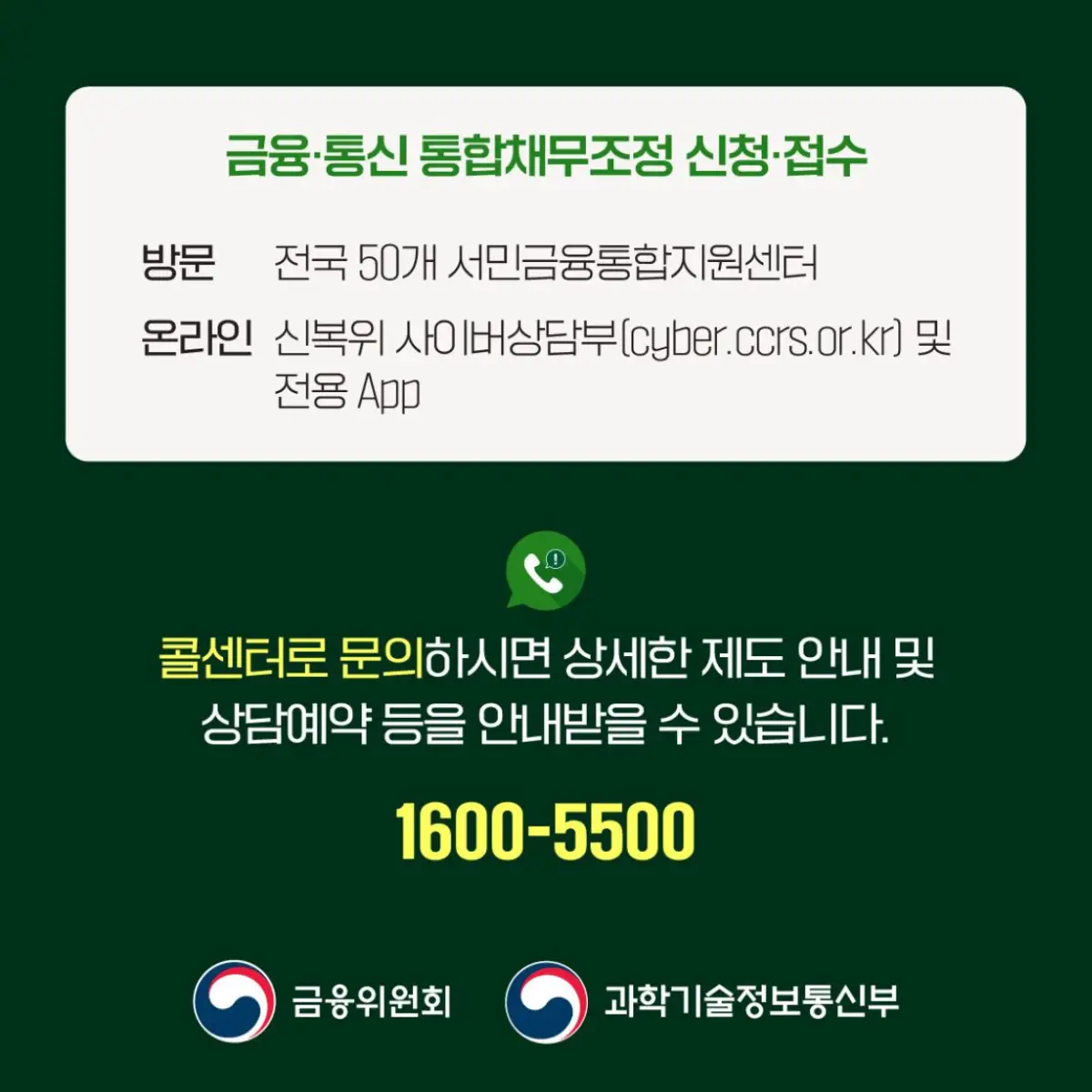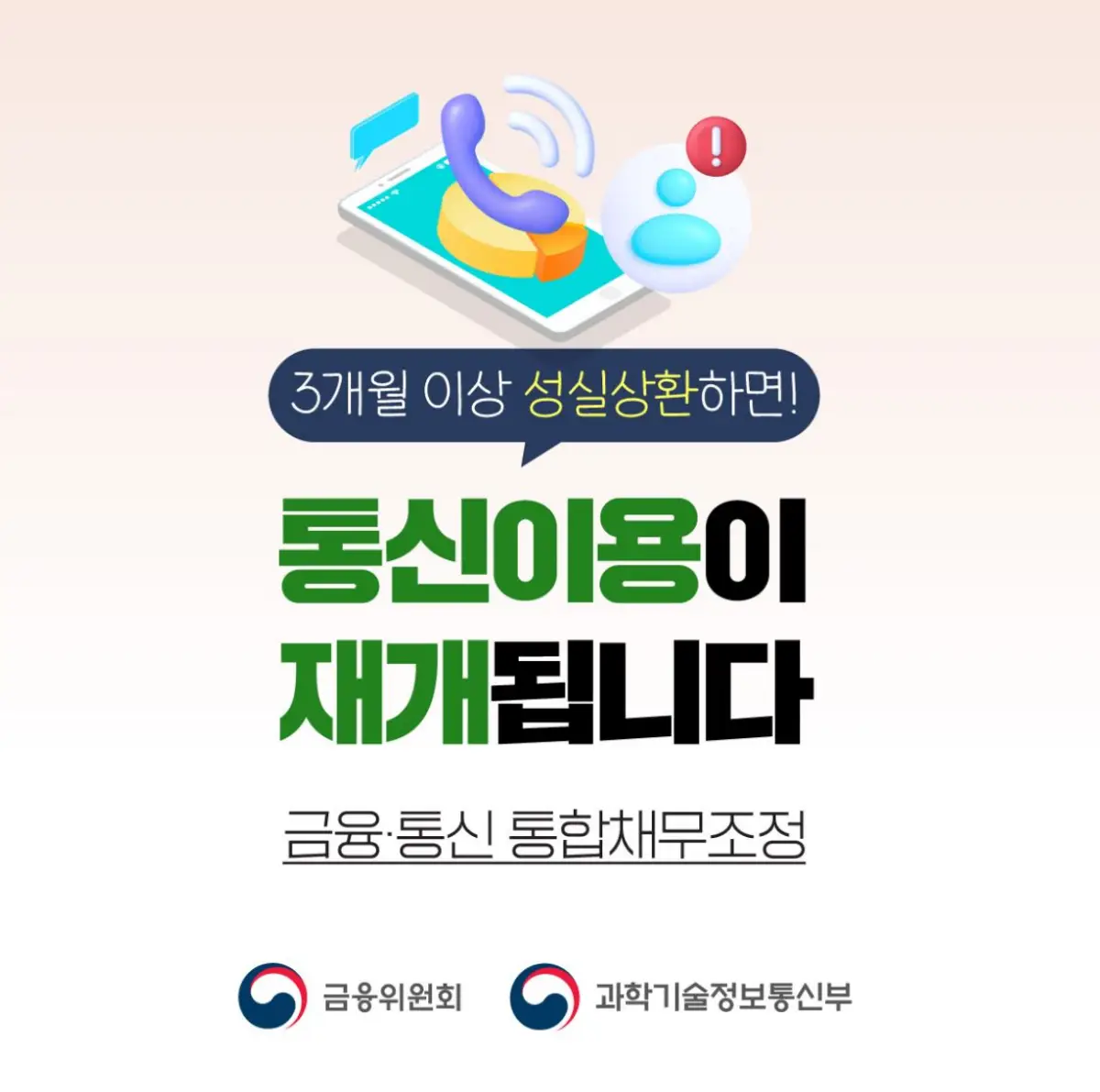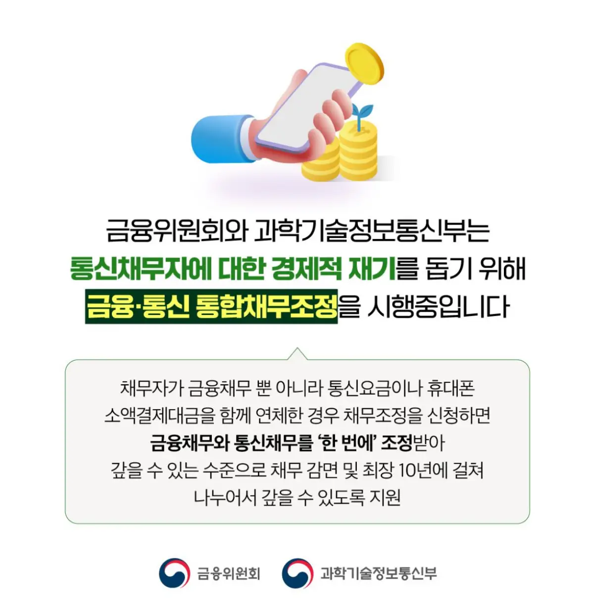 금융위원회와 과학기술정보통신부에서 휴대폰 요금을 연체하여 일을 할 수 없는 분들을 위해 내가 가지고 있는 금융채무인 카드연체와 대출, 그리고 밀린 통신요금을 합쳐서 한번에 채무조정을 받을 수 있습니다.